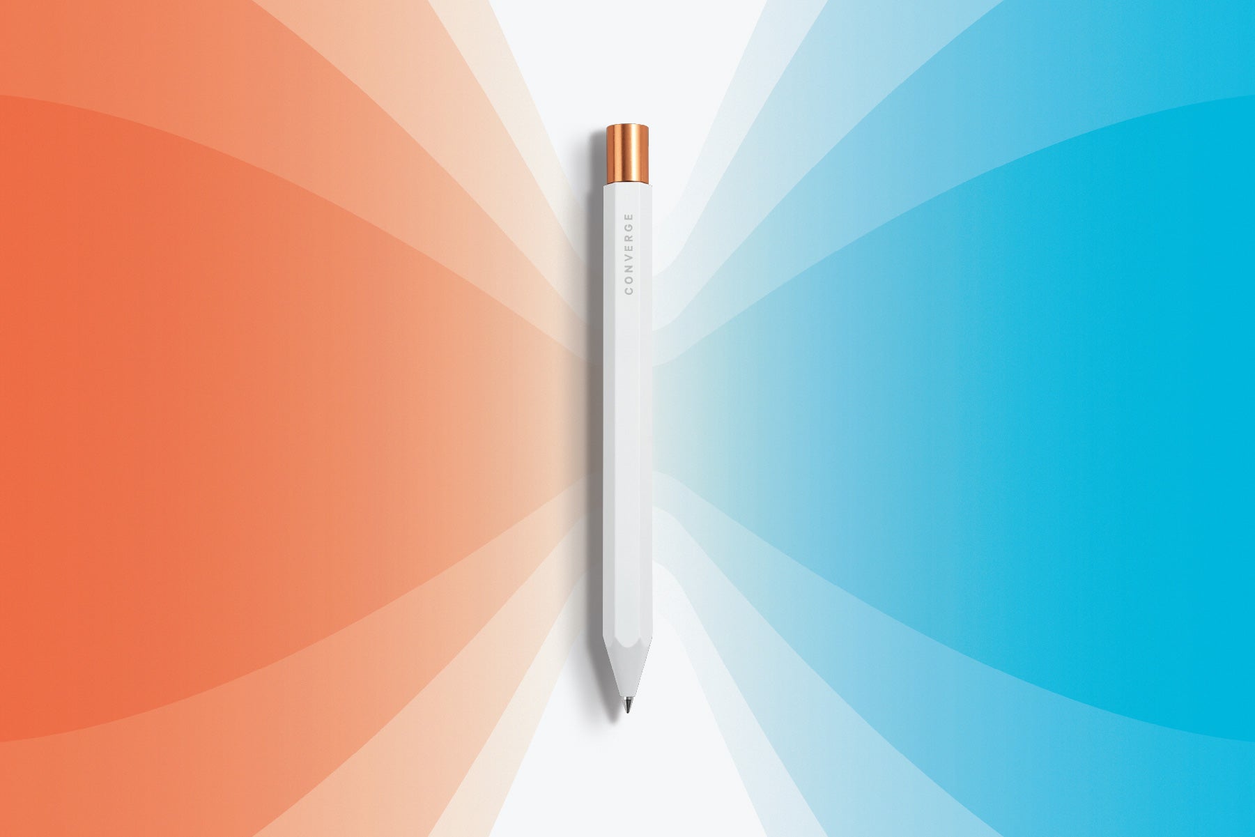 Draft Writing Squire Classic pen on a blue background with pink paper and pink pencils