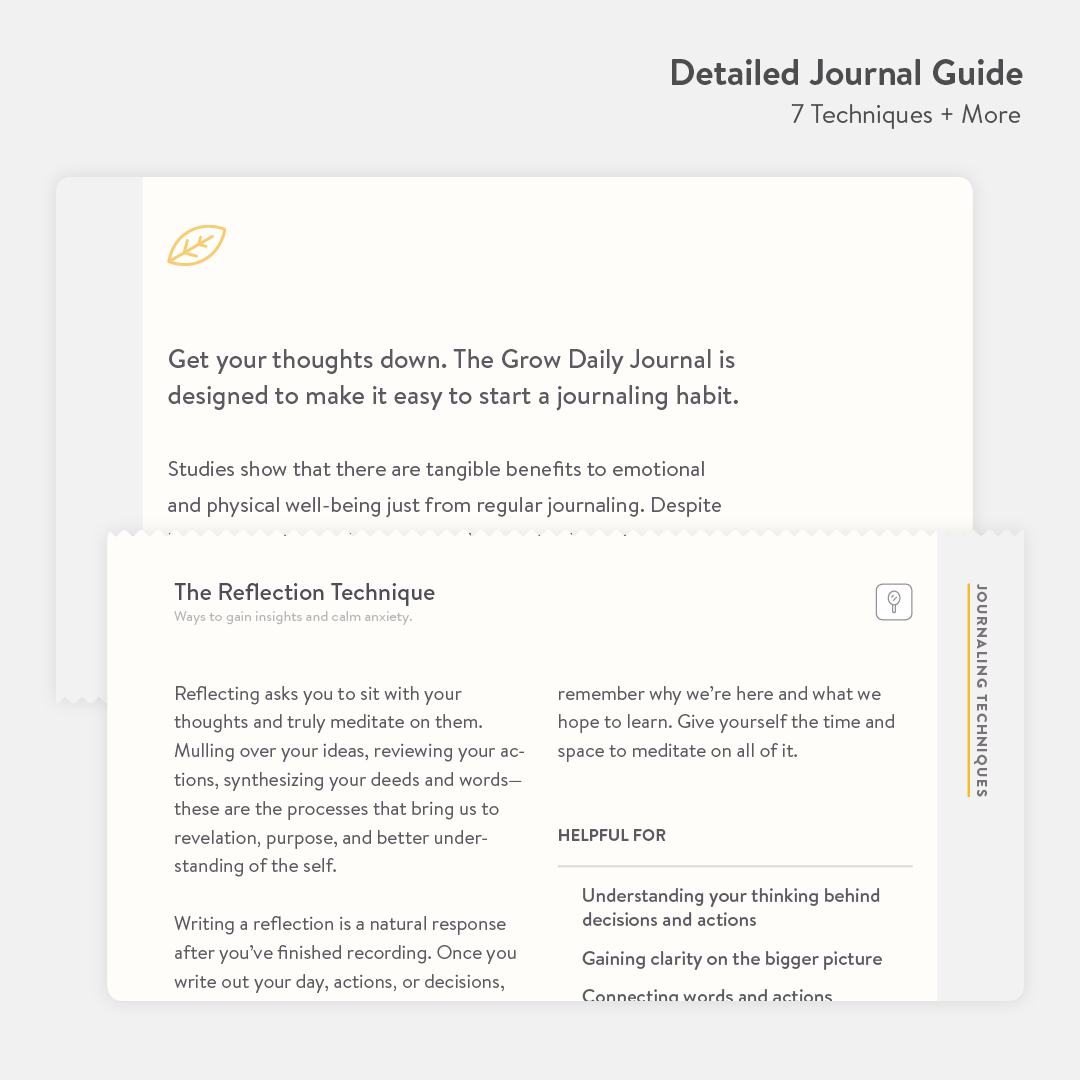 Grow is a guided daily journal designed to help you start—and sustain—a journaling habit. Whether you're new to the practice or returning to it with fresh eyes, Grow offers a calm, clear space to reflect.
